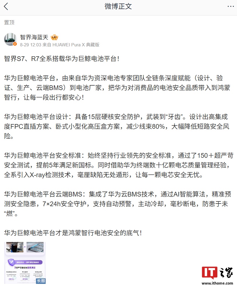IT之家 8 月 31 日消息,据智界产品总监 @智界海蓝天 分享,鸿蒙智行智界 S7、R7 汽车全系搭载华为巨鲸电池平台,该平台由来自华为资深电池专家团队全链条深度赋能(设计、验证、生产、云端 BMS)到电池厂家。